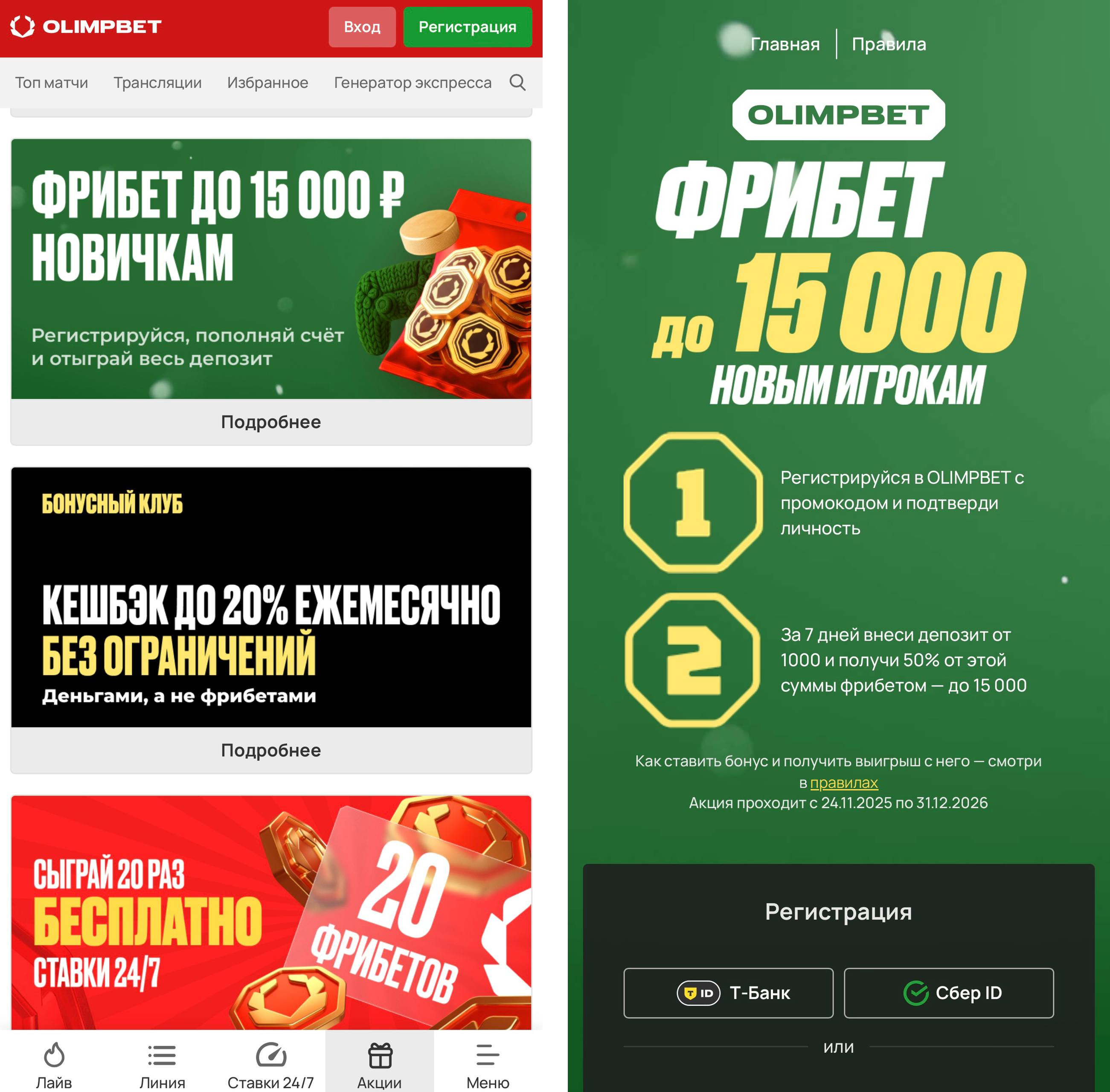 После успешного прохождения идентификации БК OLIMPBET дает возможность новому игроку получить вступительный фрибет до 15 000 рублей.