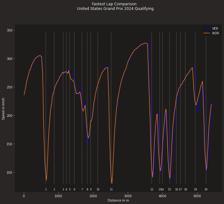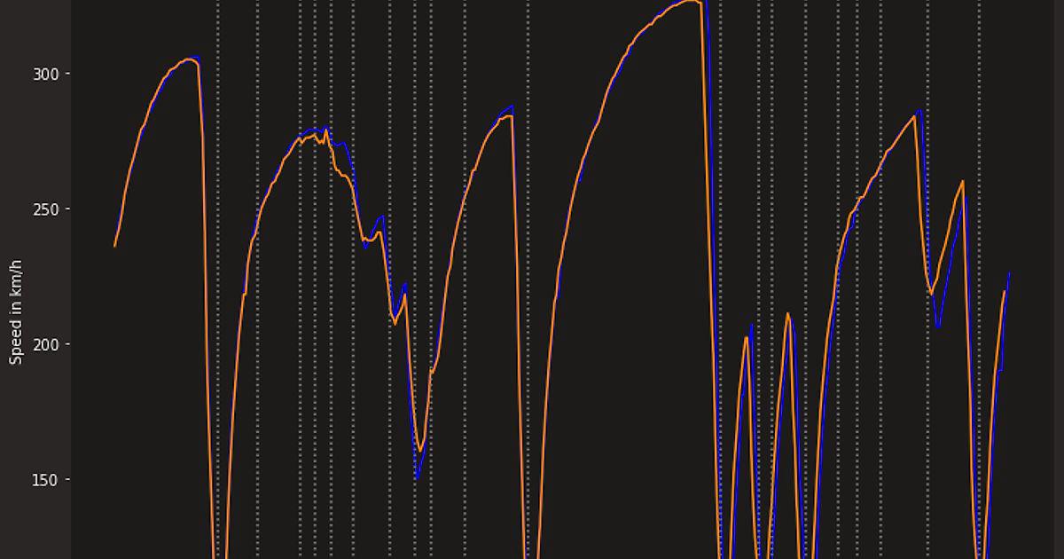 По оси у- отложена скорость каждого гонщика, по оси х - отложена дистанция трассы. Вертикальными линиями показаны номера соответствующих поворотов. Оранжевым цветом показан график скорости - Ландо Норриса, а синим соответственно Макса Ферстаппена.