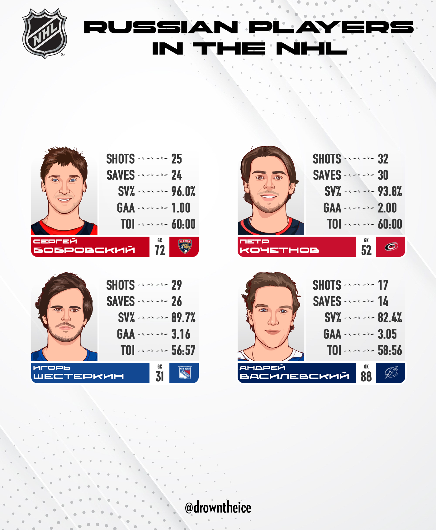 А вот так выглядит статистика вратарей. Бобровский и Кочетков ушли со льда с победой, Шестеркину и Василевскому так не повезло.