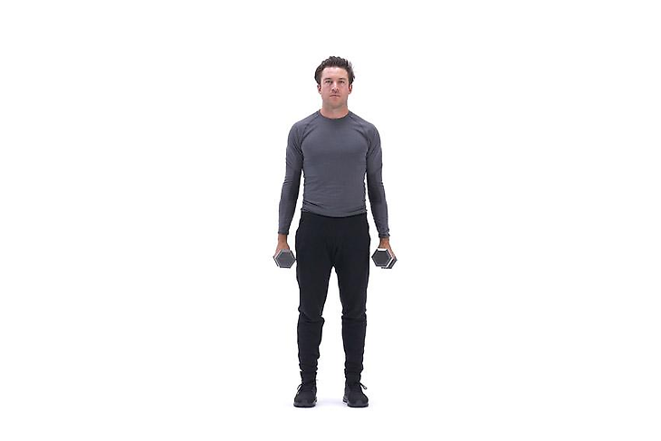 - На выдохе плавно поднимите запястья вверх, поднимая гантели вверх до максимального сокращения мышц. В верхней точке сделайте паузу в 2-3 секунды для пикового сокращения.