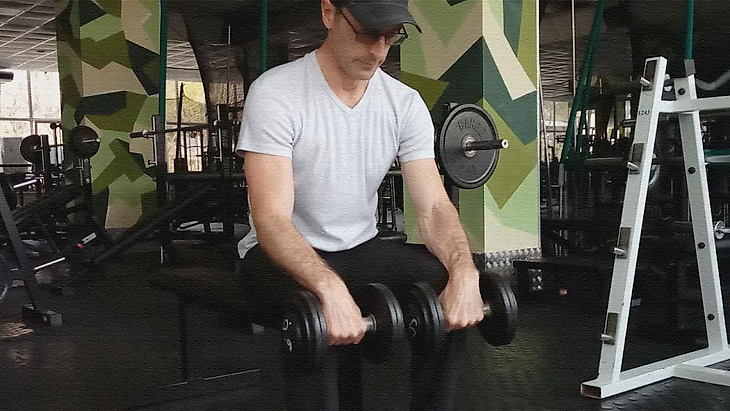 - Возьмите гантели супинированным хватом (ладони направлены вверх) и расположите предплечья на ногах таким образом, чтобы кисти выходили за пределы колен. Важно поддерживать естественный прогиб в пояснице и прямое положение спины.