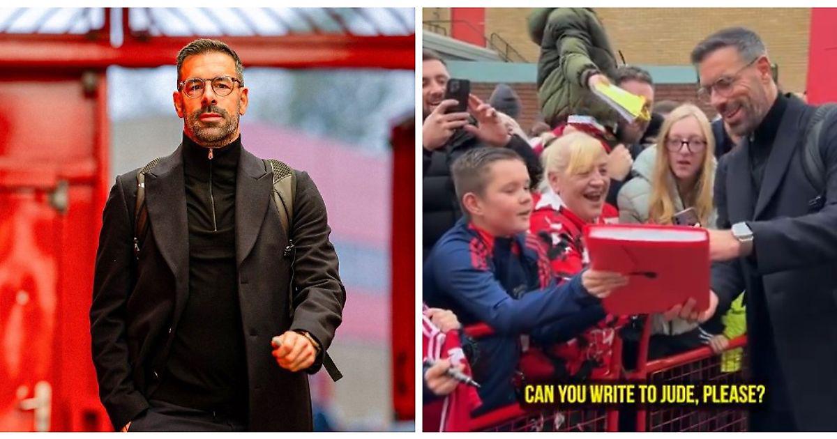 Ван Нистелрой приехал на «Олд Траффорд» в хорошем настроении. Тренер успел поболтать с юным болельщиком, который попросил голландца оставить автограф на своем старом фото.
