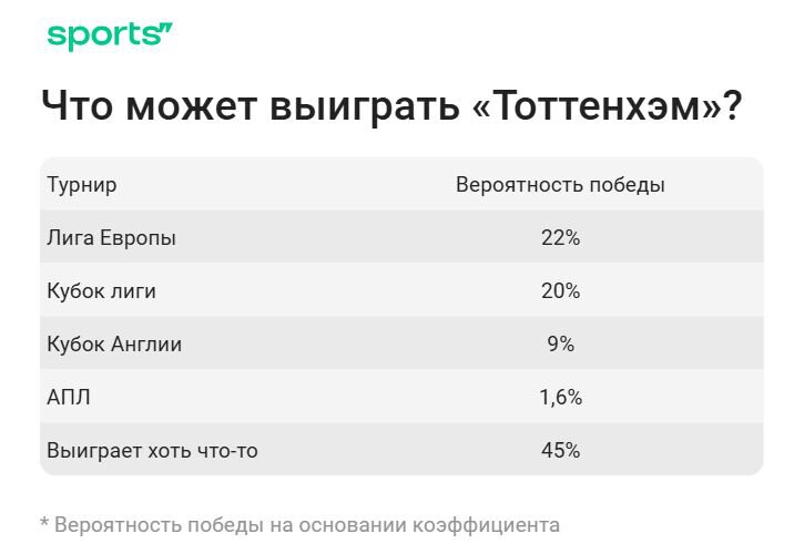 У английских букмекеров есть и общие линии на итоги сезона для «Тоттенхэма». После победы над «Манчестер Сити» вероятность выиграть хотя бы один титул подросла до 45% (2.25).