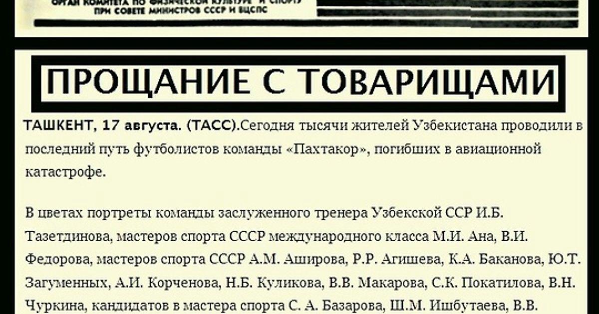 Не случись всего перечисленного... Увеличение количества команд, либо это увеличение произошло годом ранее.... Повышение в классе минского «Динамо»... Возвращения футбола в программу Спартакиады... Футболисты просто не сели бы в тот злосчастный самолет, который столкнулся в небе с другим, под командованием пилота А. ТАРАНенко (выделено автором). Пахтакоровцам просто не надо было бы лететь 11 августа в Минск.