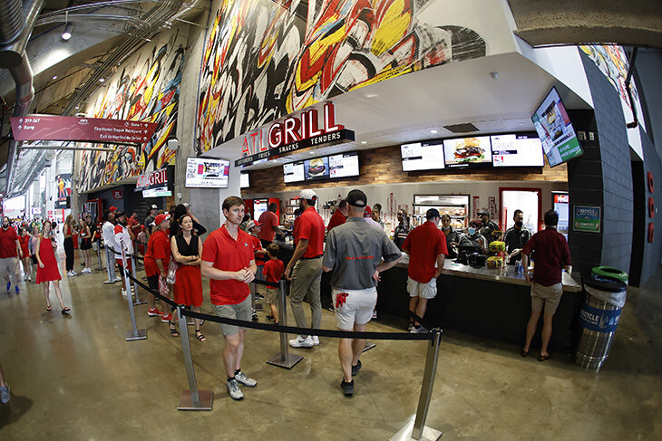 Важная деталь 70-тысячного стадиона – возможность качественно провести время до и после матча. Это не обычные ларьки с хот-догами и газировкой (хотя без них тоже никуда). Внутри «Мерседес-Бенц Арены» – только местные компании, объединенные названием Best of Atlanta: мороженое Bruster’s Real Ice Cream, сладости Snackology 101 Market и Sublime Doughnuts, хот-доги Delia’s Chicken Sausage, ребрышки Fox Bros. Bar-B-Q и Jim ‘N Nick’s, попкорн Miss D’s Popcorn.