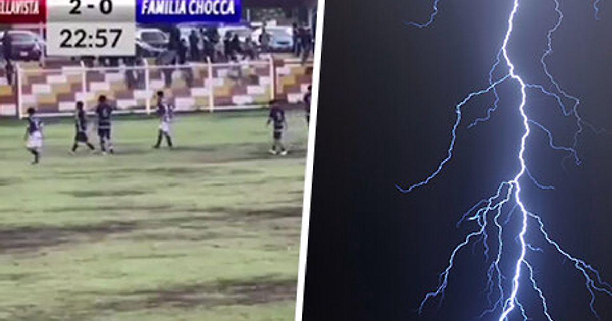 Когда футболисты уходили с поля, снова полыхнула молния. Матч транслировали, момент виден на записи. После удара на поле рухнули минимум восемь человек в кадре.