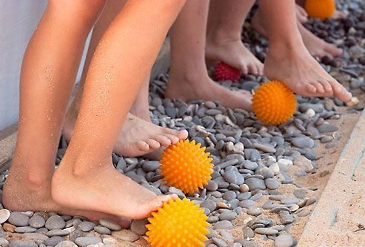 Подходит для укрепления мышц стопы и развития ее подвижности. Встаньте прямо, возьмите небольшой твердый мяч и поместите его под верхнюю часть стопы. Затем пытайтесь «обнять» мяч стопой, сгибая пальцы и подтягивая их к голени. После этого расслабьте стопу. Повторите упражнение 10-12 раз для каждой ноги.