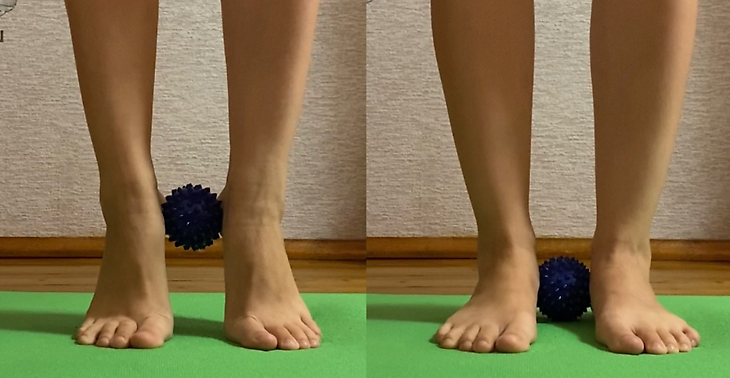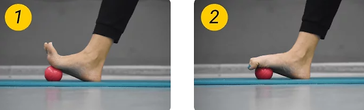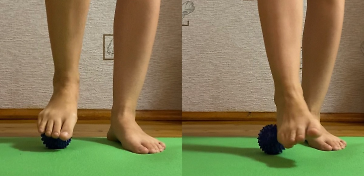 Для выполнения упражнения подойдет любой достаточно твердый мяч, например, теннисный или специальный массажный мяч. В положении стоя необходимо плавно перекатывать мяч по всей поверхности стопы, от пальцев до пятки, уделяя внимание проблемным зонам. Важно контролировать давление на стопу и избегать болевых ощущений. Рекомендуется выполнить 10-12 повторений для каждой стопы.
