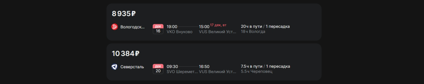 Прямых рейсов между Москвой и Великим Устюгом нет, однако по мере наступления туристического сезона они могут появиться. Добраться по воздуху можно через Вологду (стоимость билета – от 8 000 рублей) или Череповец (здесь билет будет немного дороже – от 10 000 рублей).