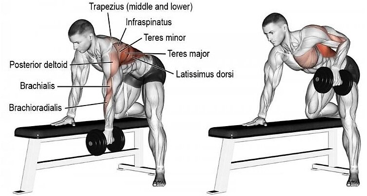 - Упритесь коленом и рукой в горизонтальную скамью (для акцента на нижнюю часть широчайших) или обопритесь рукой о гантельную стойку, слегка согнув ноги в коленях и наклонив корпус вперед под углом примерно 45 градусов (для акцента на верхнюю часть широчайших). Спина прямая, сохраняйте естественный прогиб в пояснице, взгляд направлен вперед.