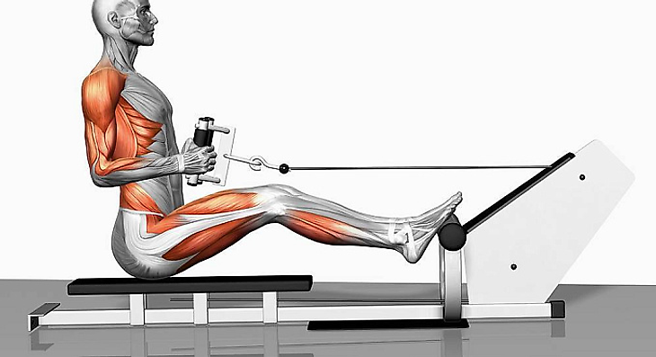 - На выдохе плавно подтяните рукоять к нижней части живота, сводя лопатки вместе. Локти должны двигаться близко к корпусу. В конечной точке движения дополнительно напрягите мышцы спины.