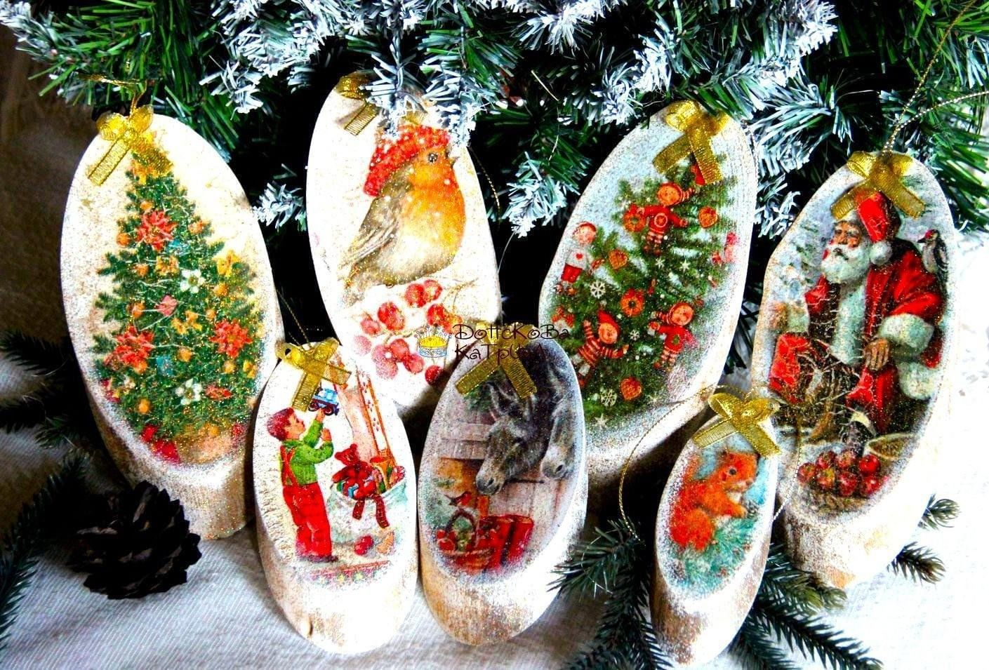 Из трехслойной салфетки вырезаем те новогодние рисунки, которые нам необходимы. Для работы нам понадобится верхний самый яркий слой салфетки. Прикладываем изображение к поверхности нашей основы, аккуратно смазываем сверху рисунок декупажным клеем, двигаясь от центра к краям. Рисунок приклеен, даем ему время просохнуть. Затем наносим на рисунок акриловый лак в несколько слоев с просушкой каждого. Можно нанести дополнительный декор в виде блесток и иных элементов.
