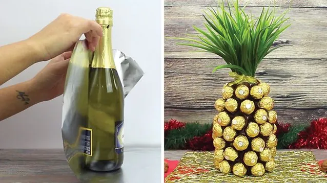 Бутылка шампанского с конфетами в виде ананаса своими руками на Новый год