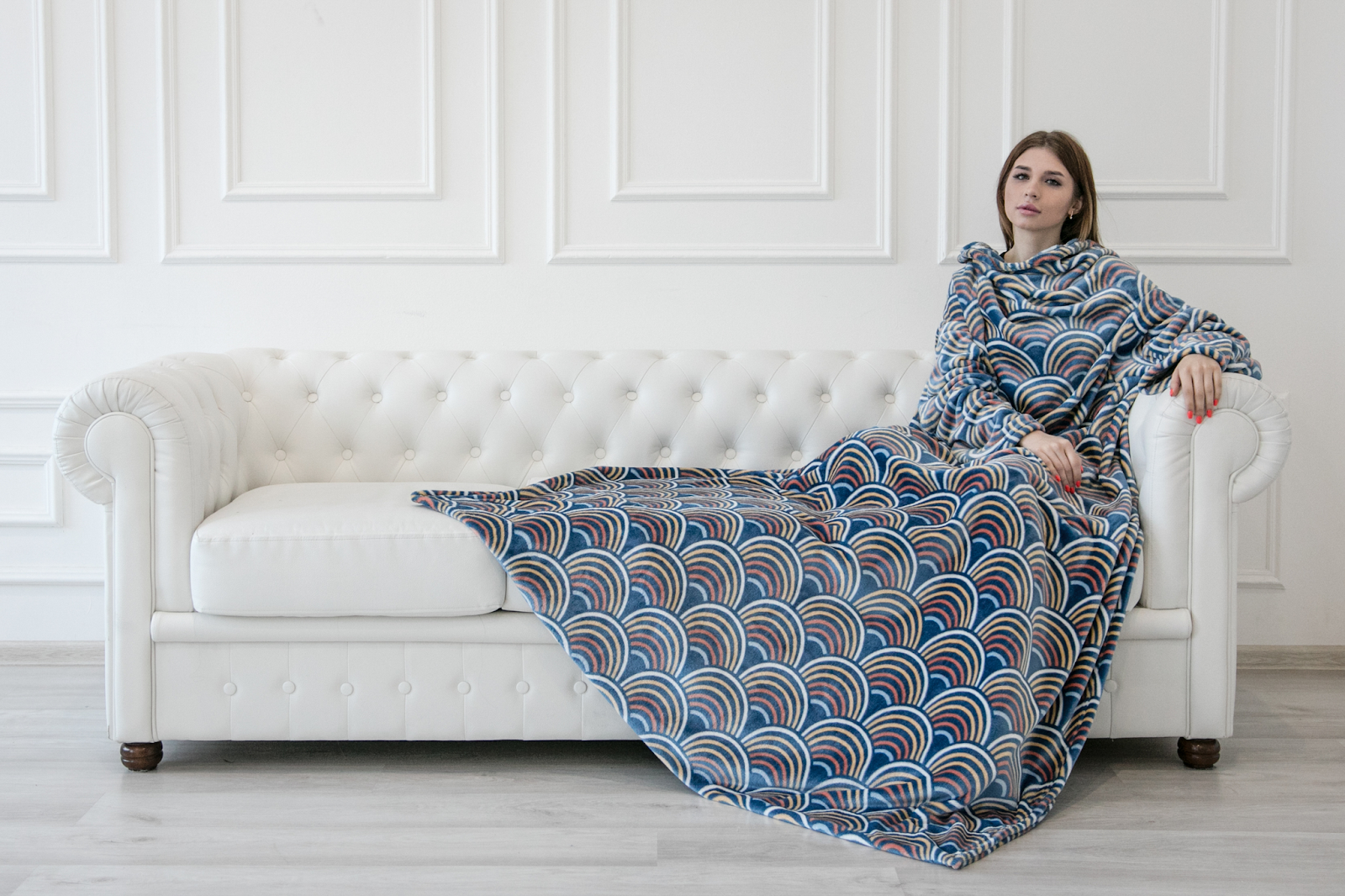 Плед с рукавами – это по сути своей классический плед, но, сюрприз, с двумя отверстиями для рук. Это очень удобное изобретение, если ваша супруга любит посидеть на диване с ноутбуком или смартфоном. Существуют и парные модели, когда рукавов не два, а сразу четыре – специально для тех, кто любит сидеть под пледиком вдвоем. Правда, в этом случае большой вопрос, нужны ли такому пледу рукава…
