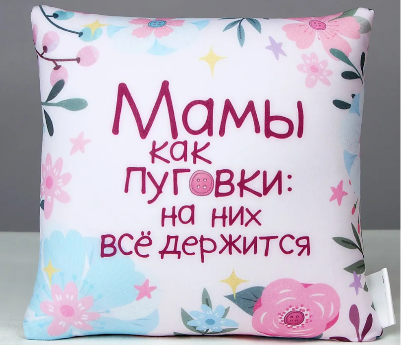 Наполнитель подушки создает комфортное положение для головы и ее можно брать с собой куда угодно. А если на ней еще и текст принта о маме, то ей будет вдвойне приятно.