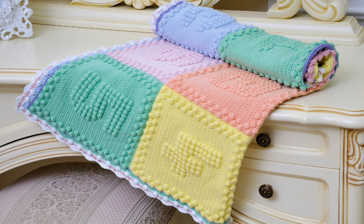 Вязаный плед приятных цветов пригодится грудничку во время его сна и игр на полу. Ребенку будет комфортно и тепло под пледом и важно, чтобы он был из натуральной ткани.