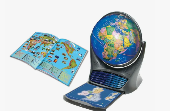В набор с глобусом входит сенсорная указка, которой при нажатии на точку земли, можно прослушать подробную информацию об этой местности (кто там живет, факты из истории).