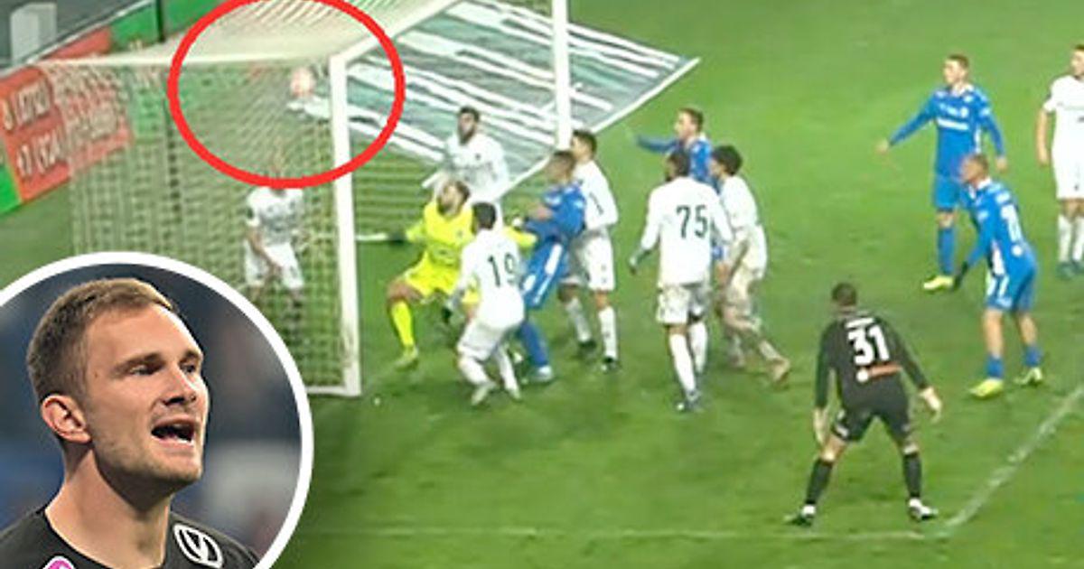 Падая сверху, мяч оказался между рукой Шелии и перекладиной.