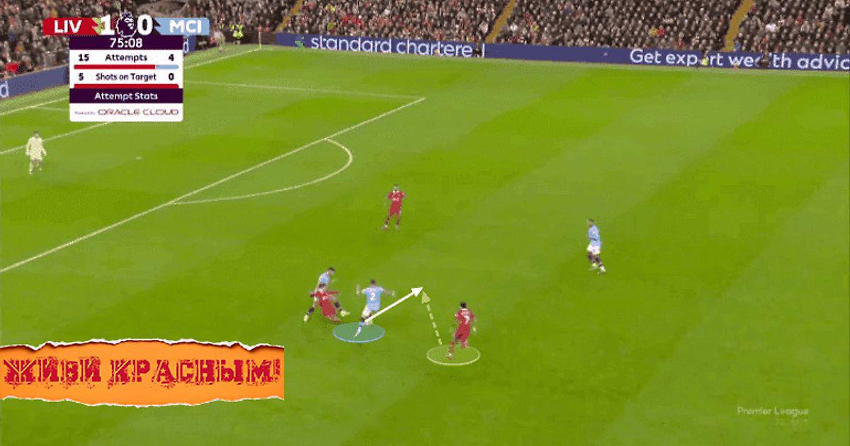 Уокер отдает пас вперед на Бернарду Силву, который под давлением Алексиса Мак Аллистера уклоняется от мяча и пропускает его через себя на Льюиса. Робертсон в этот момент находится в 10 метрах от Льюиса.