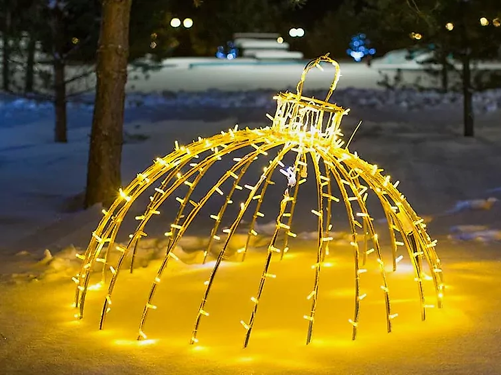 Многие украшают двор фигурами из гирлянд. Основа может быть какая угодно, чаще всего можно увидеть оленей, причем они продаются уже готовые. Купите и будете использовать не один год. Помимо оленей фигуры могут быть разными, в некоторых случаях тоже можно обойтись своими руками. Два десятка металлических прутьев или банальной проволоки и можно соорудить елочную игрушку в снегу подсвеченную гирляндами.