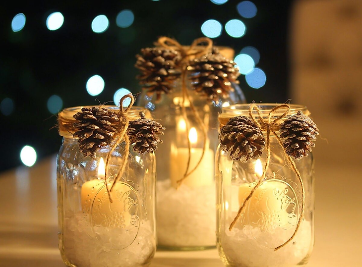 В самом простом варианте, который показан на нашей фотографии, достаточно будет поместить на дно банки основу в виде крупной соли, она будет выполнять роль снега, поставить на нее свечу. Вокруг горлышка банки повязать бечевку и прикрепить к ней сосновые шишки. Дальше можно включить фантазию, что-то нарисовать на банке или вырезать рисунок из фольги и прикрепить к стенкам сосуда. Обмотать банку бечевкой в произвольном порядке, создав таинственный свет и так далее.