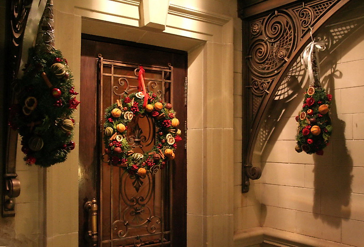 Хвойный венок – это классика, причем многим кажется, что украшать таким образом дверь это европейская или американская традиция, пришедшая к нам из Европы и Америке, но ничего подобного. В былые времена на Рождество так двери украшали и в России. Сплести такой венок не составит труда. Как правило, венки украшают небольшими елочными игрушками, шишками или гирляндами, но композицию перегружать не стоит. Некоторые стремятся украсить дверь по-максимуму вплоть до мишуры на дверные ручки, но это явно перебор, который создает неудобства при открывании.