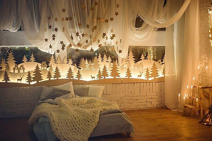 Стены и потолок можно декорировать светящимися лентами, делать из них любые рисунки и надписи. Окна следует украсить снежинками. Все из детства знают старый способ, как это сделать, причем снежинки можно вырезать своими руками вместе с детьми.