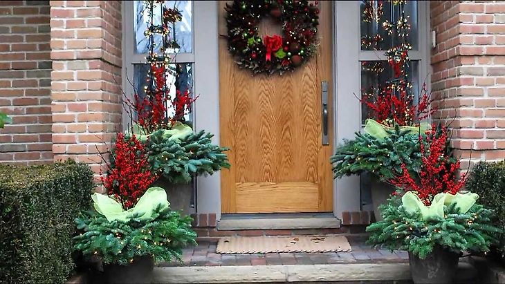 Оформить пространство перед домом можно с помощью нескольких больших вазонов с хвойными ветками. Купить подобные вазоны в специализированном магазине уже с небольшими деревцами сегодня не составляет проблемы, но если подключить фантазию, то можно обойтись без дорогих покупок. Ветки насобирать в лесу. В зависимости от размера вазонов, туда можно засыпать любой наполнитель (земля, песок, гравий), но можно обойтись и без него. Ветки украшаем игрушками, фигурками, гирляндами, шишками.