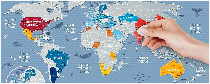 Карта мира для стирания – это отличный подарок для путешественников. Покрытые специальным слоем страны можно стирать монеткой, отмечая уже посещенные места. Это не только стильный элемент интерьера, но и способ вдохновляться на новые поездки.