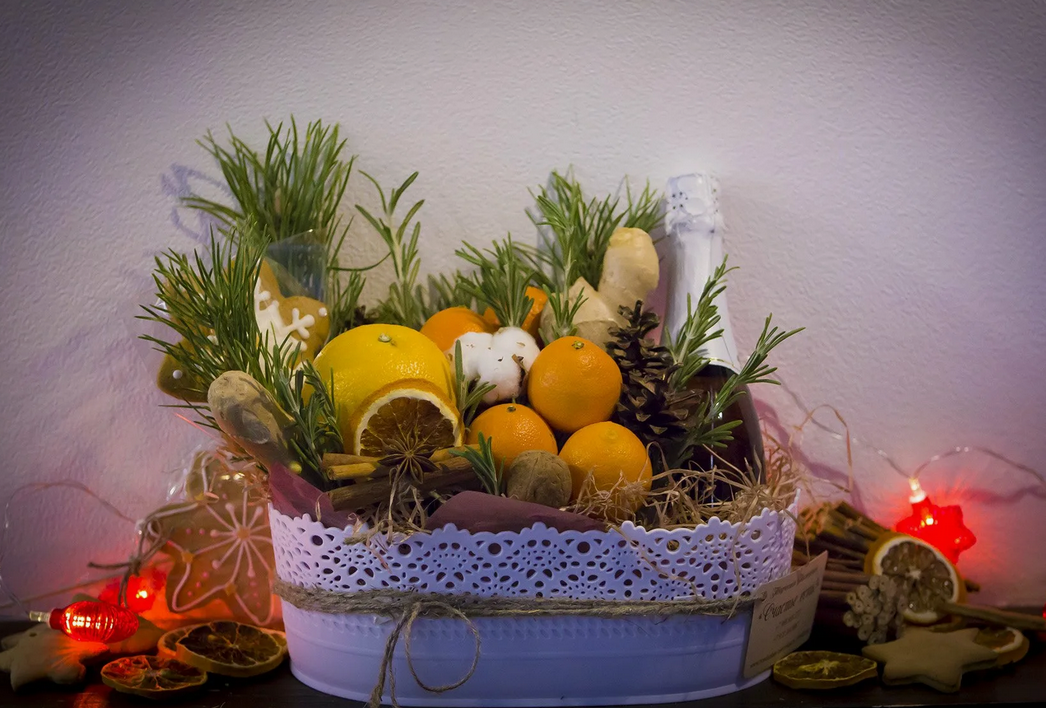 Вы можете самостоятельно собрать фруктовую корзину, добавив в нее зимние фрукты: мандарины, апельсины, ананас, манго, гранат и другие фрукты, которые ассоциируются с зимой. Также можно выбрать уже готовую сладкую корзину. В ней будут различные сладости, такие как конфеты, шоколад, варенье.