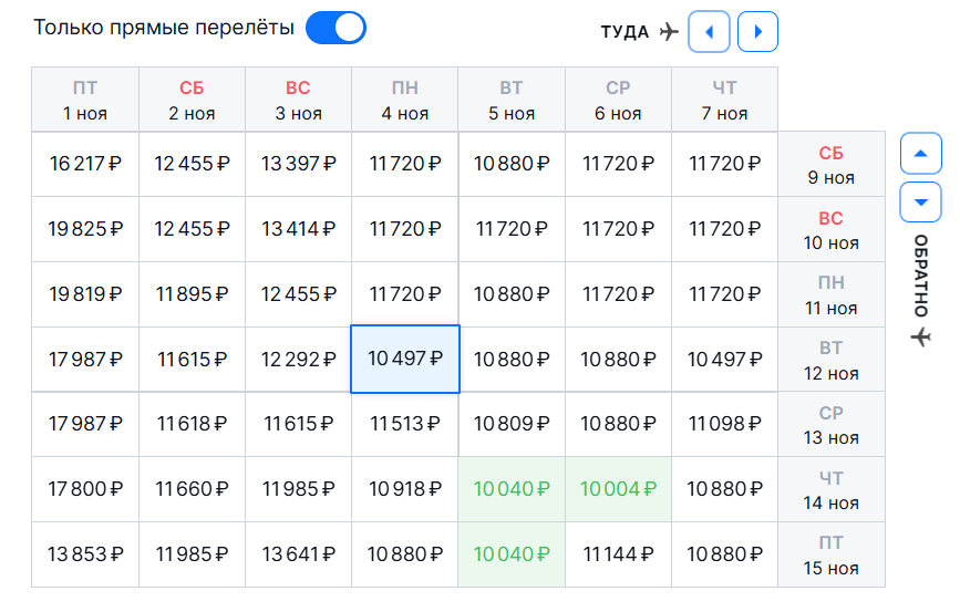 Благодаря большому количеству рейсов можно выбрать вылет в утренние часы, начиная с 08:00, дневное время — около полудня, и вечернее, начиная с 17:00 и заканчивая 00:00. Время полета составляет от полутора часов до одного часа 45 минут в обоих направлениях. Доехать до Минска из Москвы сейчас в первой половине ноября 2024 года самолетом будет стоить от 10 000 рублей без учета стоимости багажа. За него придется доплатить от 3 750 рублей.