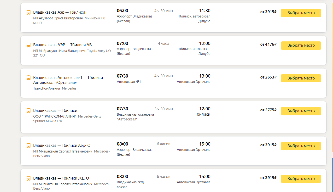 Другой вариант — доехать до Минеральных Вод или Пятигорска, откуда также можно пересесть на наземный транспорт до Грузии. Время в пути примерно такое же, а выбор отправлений из Москвы несколько больше.