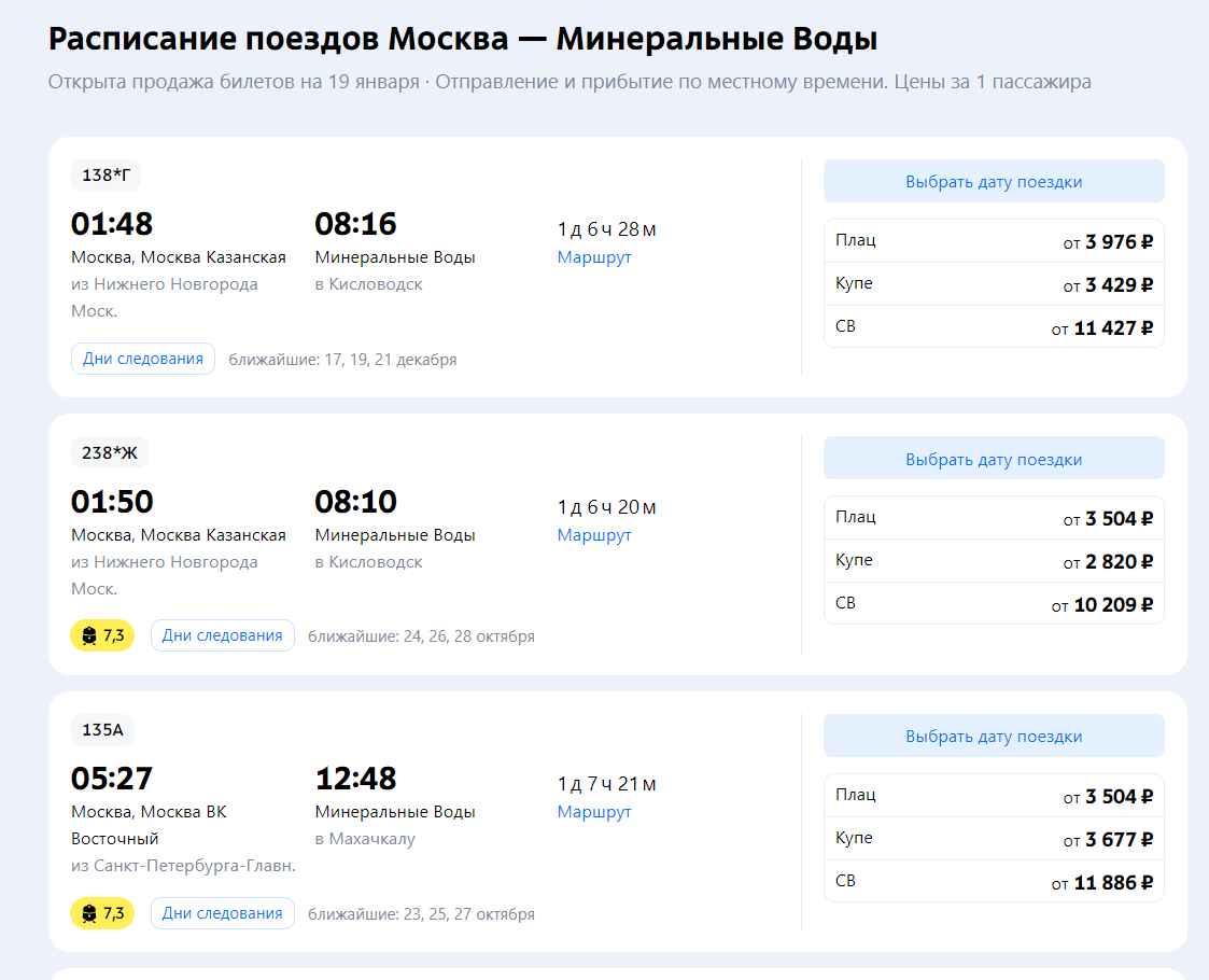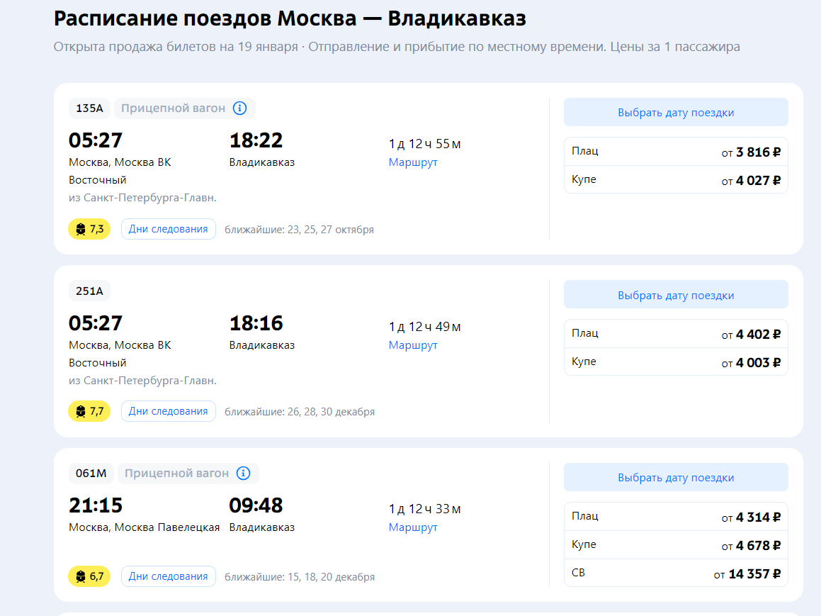 Стоимость поездки до Владикавказа или Минеральных Вод варьируется в зависимости от сезона и типа вагона. В 2024 году билеты на поезд стоят от 3 816 до 15 000 рублей в зависимости от выбранного уровня комфорта. Купе обойдется дороже, но и комфорт будет выше, а в плацкарте вы сможете сэкономить, но придется делить вагон с большим количеством попутчиков.