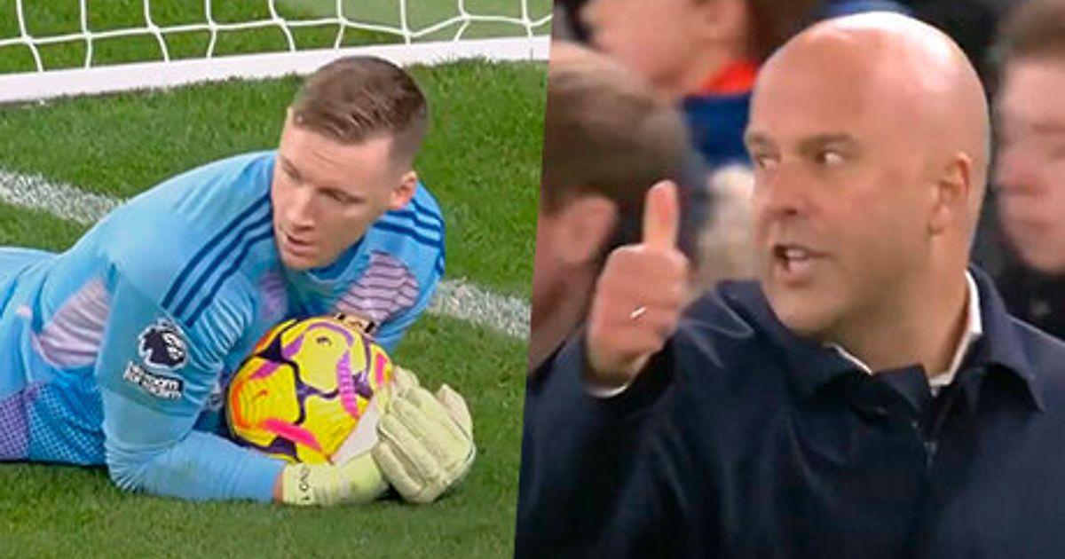 Забавный момент из трансляции матча «Ливерпуль» – «Фулхэм» на 85-й минуте. Оператор выхватил считающего Арне Слота: тренер показывал, сколько секунд вратарь «Фулхэма» Бернд Лено держал мяч в руках.
