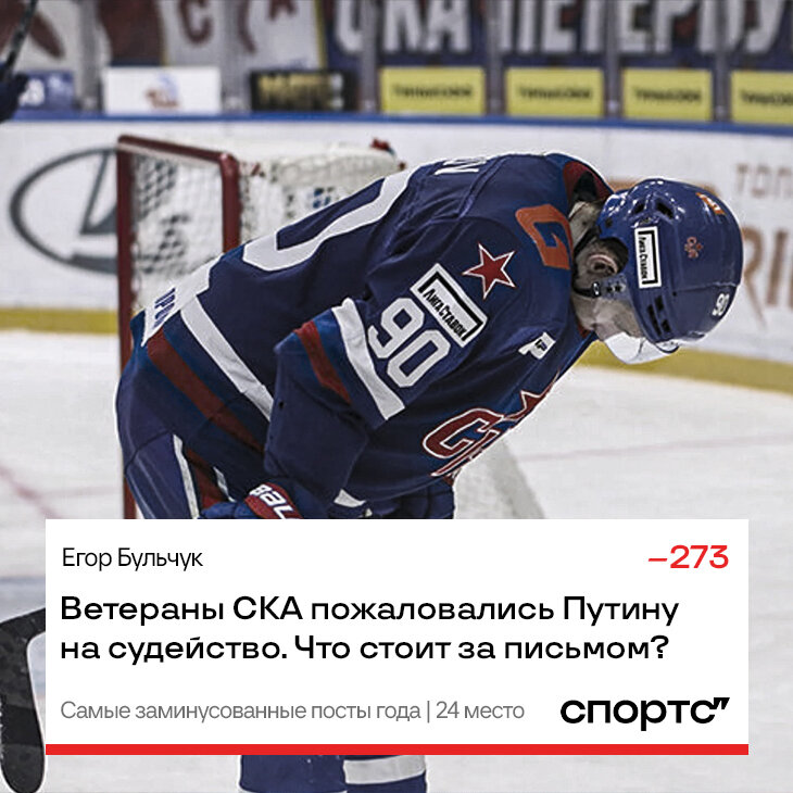 24. Новый уровень возмущения СКА: после домашнего поражения от «Металлурга» (1:2 в овертайме со скандальным голом) появилось открытое письмо от имени ветеранов клуба, адресованное президенту России Владимиру Путину, а также главам ФХР и КХЛ – Владиславу Третьяку и Алексею Морозову.