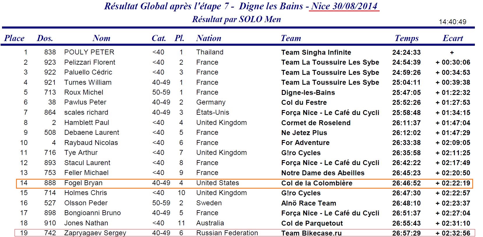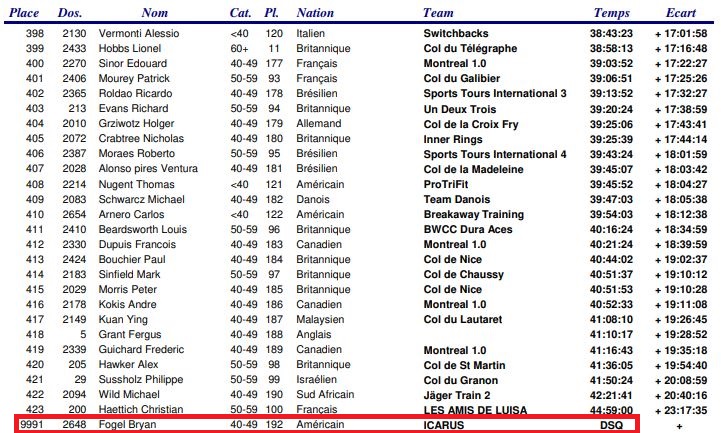 Примечание – результат Брайан Фогеля в 2015-году, судя по протоколам – дисквалификация; возможно дисквалификация произошла после выхода фильма, перед последним днем Фогель занимал тридцать четвертую позицию, уступая даже своему партнеру по команде Дэвиду Шульхофу. Икар (Icarus) – название команды, в которой кроме Шульхофа и Фогеля, участие в велогонке принял Крис Харрис (с 2016 года Крис Харрис один из ведущих Top Gear).