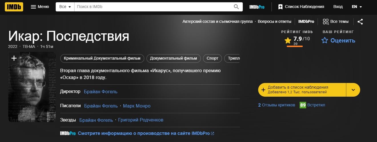 Я не снимал свой собственный фильм, ничего не перемонтировал, всего лишь подробно (на сколько хватило сил) пересказал фильм. Общеизвестный факт - фильм был перемонтирован после премьерного показа на фестивале Sundance, когда права на него купила компания Netflix. Если фильм смотреть внимательно, то можно заподозрить создателей, в том, что они хотели разоблачить ВАДА, но в итоговом варианте получился винегрет из умышленных недомолвок, искажений и клюквы. По причине, которой у него оказалось столько поклонников (в фильме есть ответ), по той же причине продолжение оказалось никому не нужным. Начиная с расследования Паунда, примерно, месяцев за девять до очередной олимпиады выходил, какой-нибудь доклад, после чего вставал вопрос о допуске атлетов из России на очередные игры. Но с февраля 2022 года необходимость в них исчезла, Российские спортсмены и так мало где участвуют – цель достигнута. Выйди Икар 2 на полгода пораньше, то получил бы очередного Оскара и терабайты восторженных отзывов.