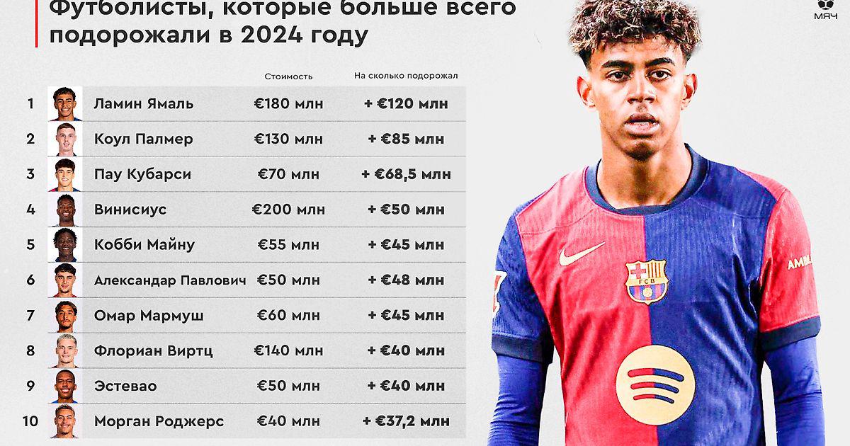 Ну и в топ-3 расположена талантливая молодежь. Пау Кубарси набрал 68,5 лямов и теперь стоит 70. Получается, что в начале 2024 года юношу оценивали только в полтора миллиона! Коул Палмер набрал 85 млн евро – так что теперь главный тащер «Челси» и автор гола в финале Евро-2024 стоит 130. Ну и главный скачок этого года совершил Ламин Ямаль. 17-летний игрок провел невероятный год, ворвавшись в основной состав «Барсы» и став одним из главных авторов победы сборной Испании на Евро. По данным Transfermarkt, стоимость парня сейчас составляет 180 млн евро, а в начале года была 60.