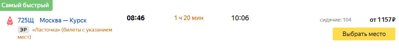 - «Ласточка» до Курска или Белгорода: комфортный способ, всего 1 час 20 минут времени в пути, билет обойдется примерно в 1 157 рублей.