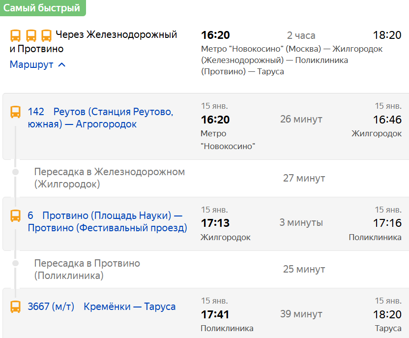 Как ни парадоксально, но наиболее быстрым по времени считается маршрут с двумя пересадками в Железнодорожном и Протвино. Поездка занимает всего два часа.
