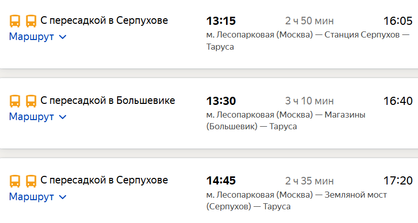- Рейсы с пересадками. Если вам не удалось попасть на прямой рейс, можно доехать до Тарусы с пересадкой через Серпухов (см. выше) или другие населенные пункты. Автобусы на этом маршруте отправляются от метро Лесопарковая примерно каждые 15 минут, время в пути в общей сложности составит до 2,5 часов.