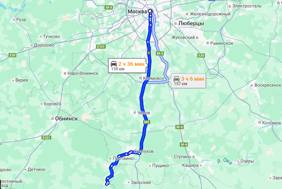 Маршрут по платной дороге через М-4 и ЦКАД удобен при наличии пробок на М-2, но он длиннее на 15–20 километров и займет больше времени (примерно 2,5–3 часа).