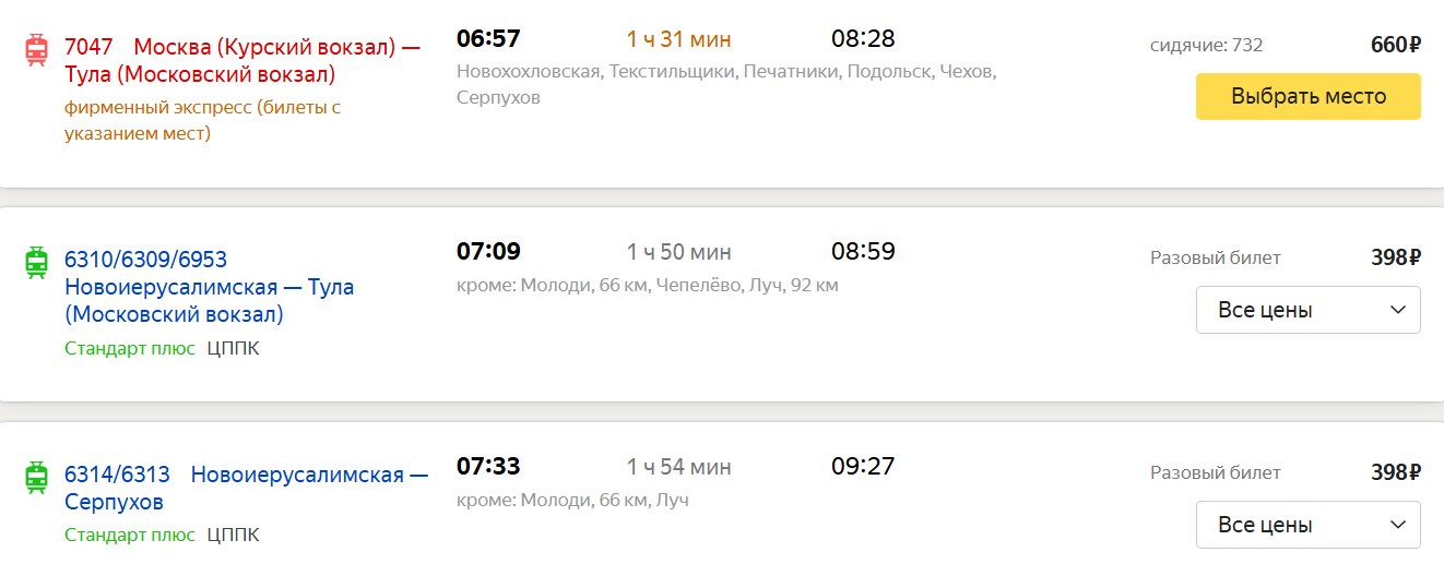 - Электропоезд Москва – Тула: быстрый маршрут, примерно 1 час 30 минут, стоимость билета – 660 рублей.