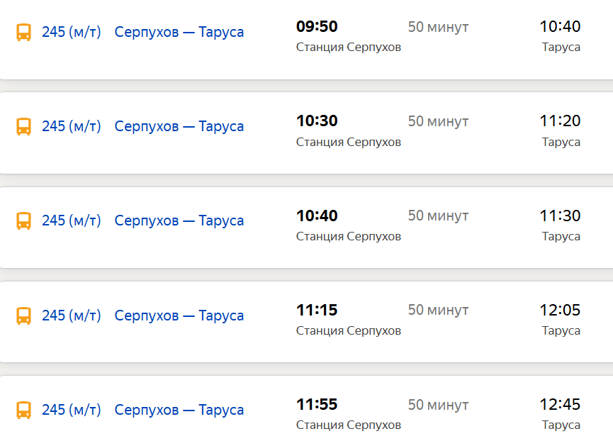 - Второй этап: Серпухов – Таруса. По прибытии в Серпухов на автобусной станции (находится рядом с железнодорожной) можно сесть на автобус №245. Автобусы отправляются с интервалом в 10–60 минут. Время в пути до Тарусы – около 50 минут, стоимость билета – 140–160 рублей.