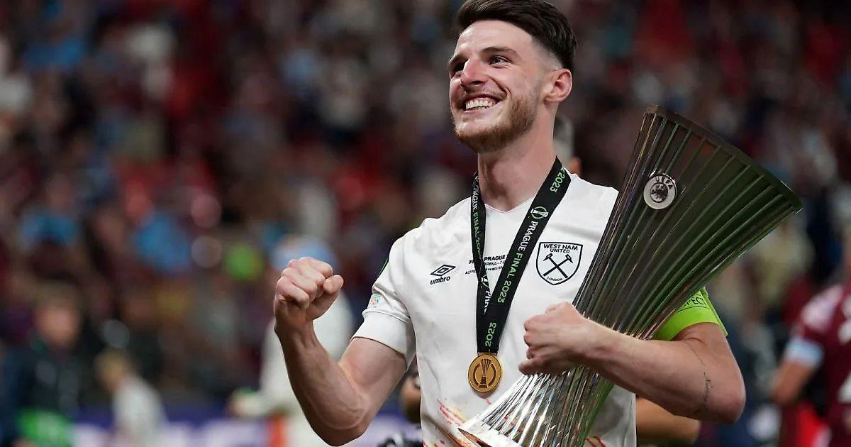 Райс празднует на поле победу в финале Лиги конференции Европы УЕФА 2023 года с West Ham United