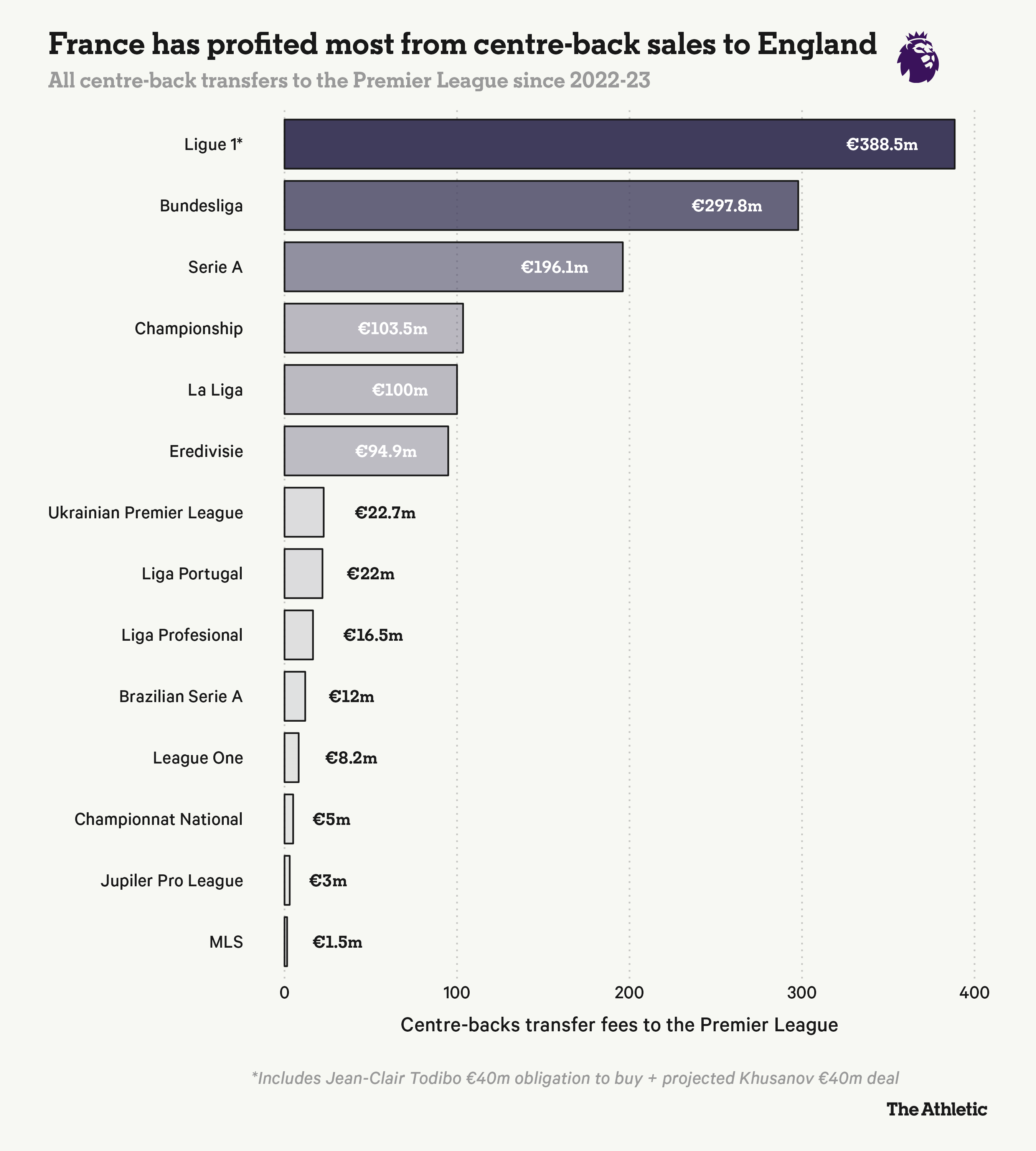 Подсчеты включают в себя трансфер Лени Йоро из «Лилля» в «Ман Юнайтед за 54 млн фунтов, аренду Жана-Клера Тодибо из «Ниццы» в «Вест Хэм» с обязательством выкупа летом за 34.2 млн фунтов и трансфер Свена Ботмана из «Лилля» в «Ньюкасл» за 35 млн фунтов. Это трое из восьми защитников, которые перебрались из Франции в Англии с начала сезона 2022/23 и за каждого из которых заплатили или заплатят более 30 млн евро.