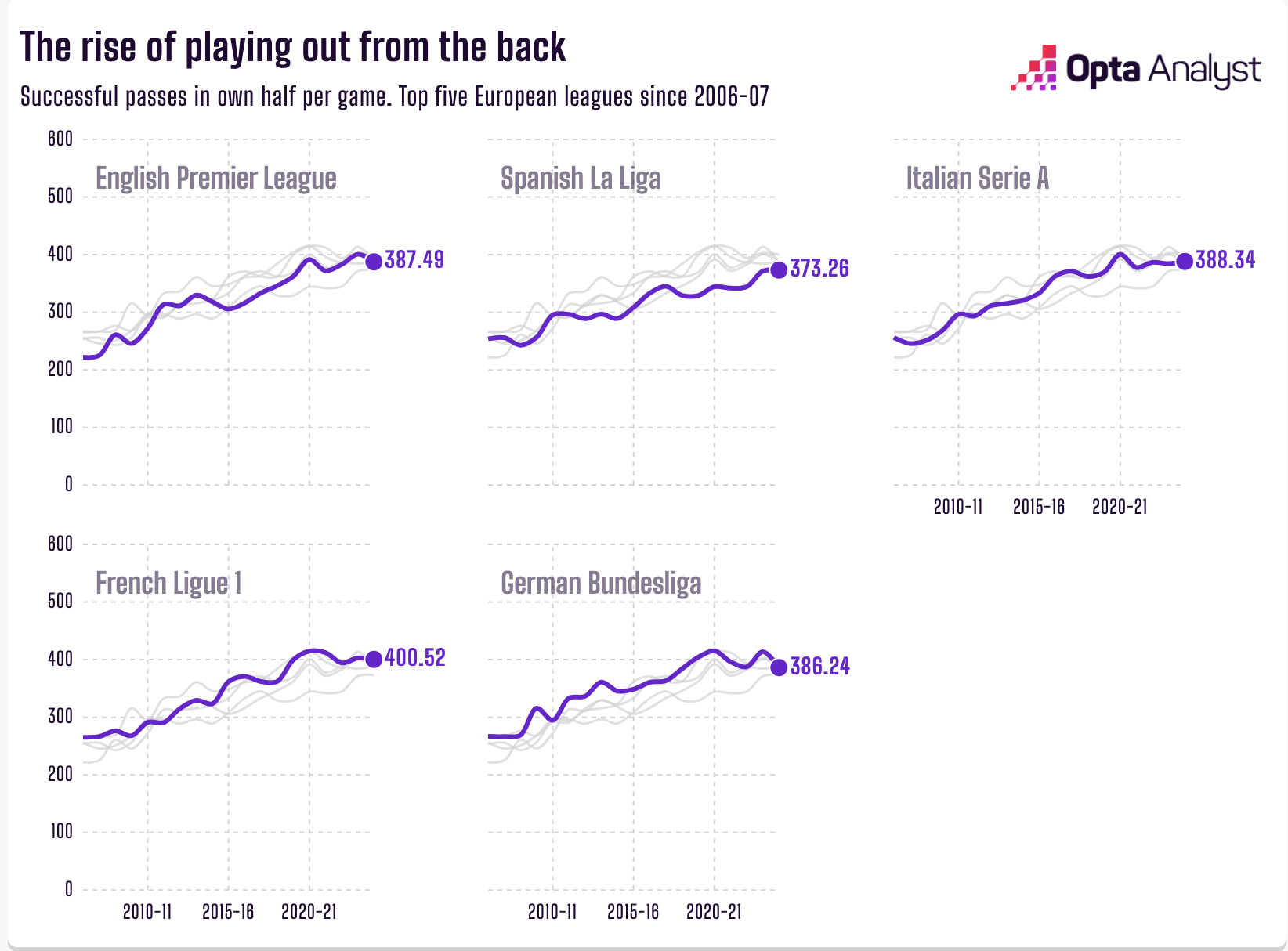 В последние сезоны команды Лиги 1 особенно охотно отводили своим защитникам важную роль в командном билд-апе. Согласно Opta, команды Лиги 1 в среднем отдают чуть более 400 передач на своей половине поля за игру. Это самый высокий показатель среди пяти ведущих европейских лиг.