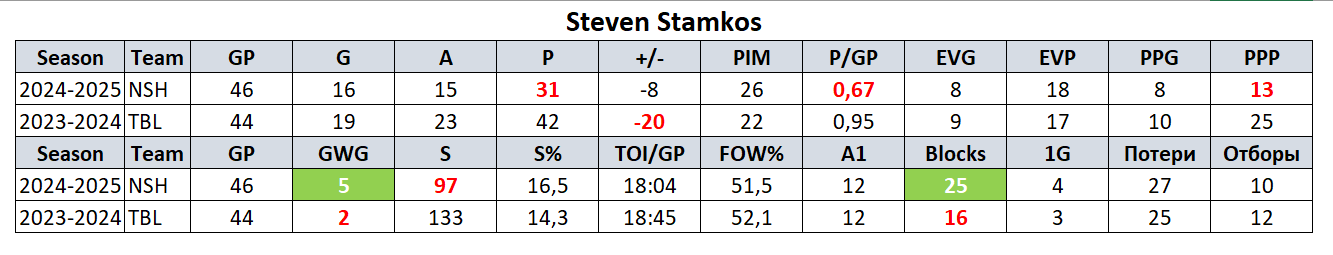 Что можно сказать? Стэмкос не стал хуже себя предыдущего, несмотря на смену команды и неудачный старт сезона. Он, как и весь «Нэшвилл», постепенно оживляет свою игру, что наглядно демонстрируют цифры. Снижение очков в большинстве, возможно, тоже носит временный характер.