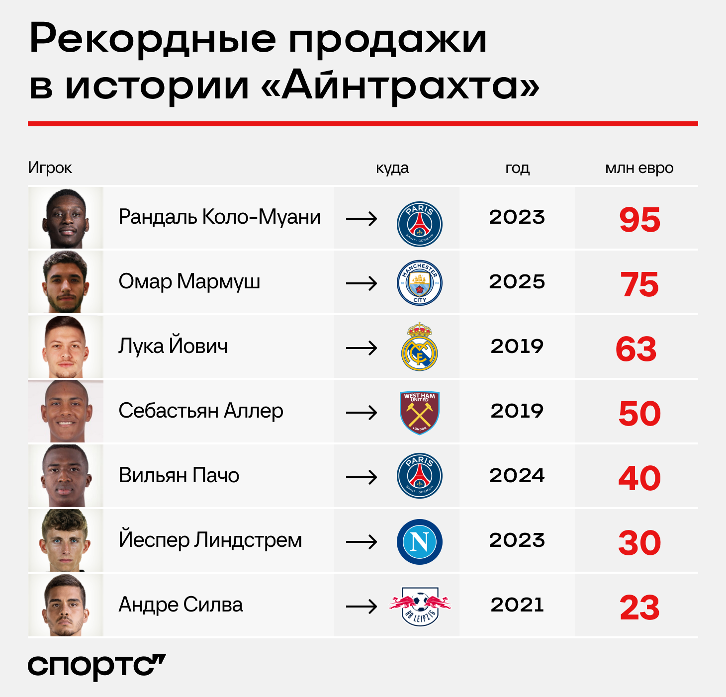 Если составить десятку крупнейших трансферов на выход в истории «Айнтрахта», то только один из них свершился до 2019-го – это был переход Кевина Траппа в 2015-м за 9,5 млн. Даже на восьмом и девятом местах были бы продажи из 2020-х – Филипа Костича в «Ювентус» (за 14,7 млн) и Джибриля Соу в «Севилью» (за 10 млн).