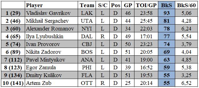 Пятерка лучших во всей лиге выглядит следующим образом: 1) Джейкоб Троуба («Рейнджерс», «Анахайм») 137 заблокированных бросков в 48 матчах; 2) Иэн Коул («Юта») 135 в 49; 3) Крис Танев («Торонто») 132 в 49; 4) Колтон Парайко («Сент-Луис Блюз») 120 в 50; 5) Радко Гудас («Анахайм») 115 в 49.